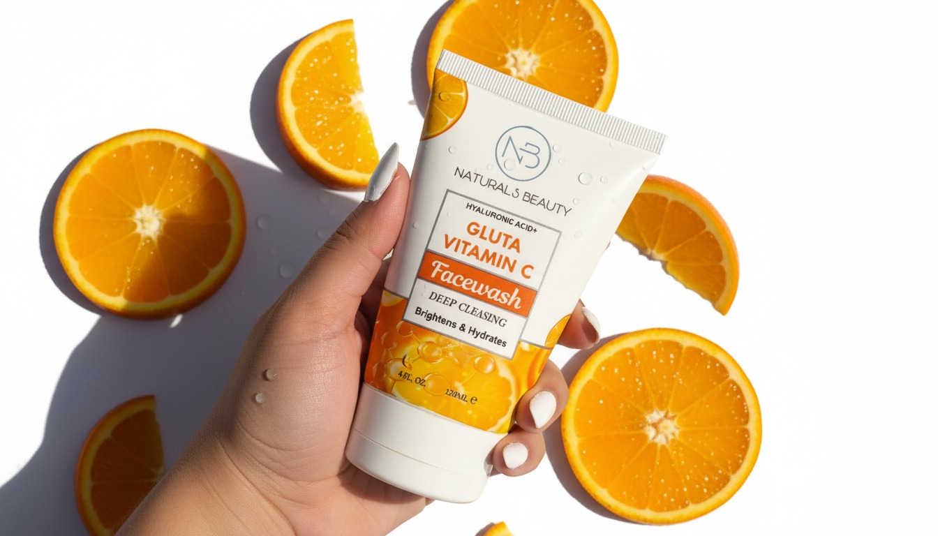A 120 ml facial cleanser formulated with hyaluronic acid, glutathione, and vitamin C. The tube has an orange‑yellow graphic of orange slices and molecular structures, suggesting a fresh, vitamin‑rich cleansing experience. The packaging highlights deep cleansing while brightening and hydrating the skin.